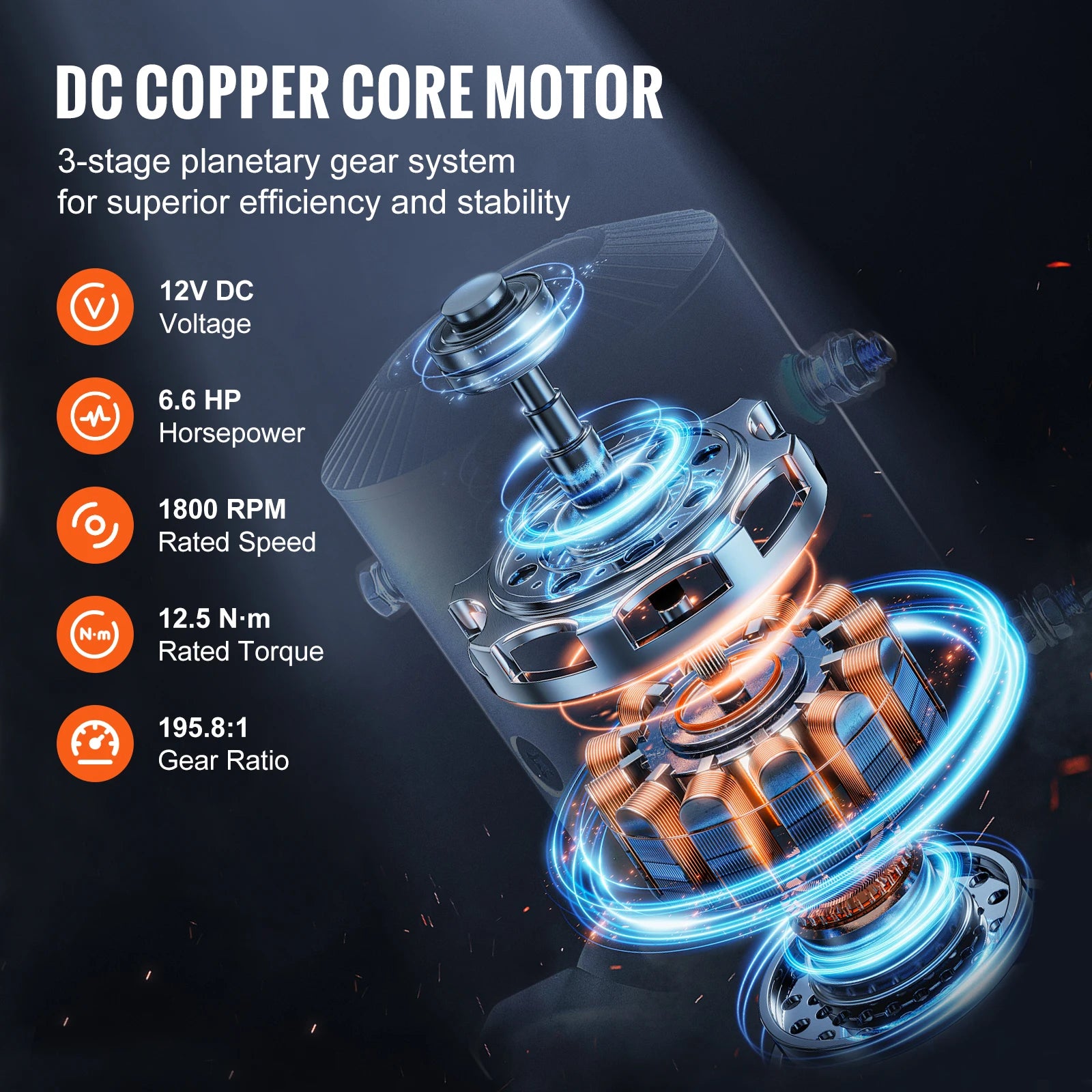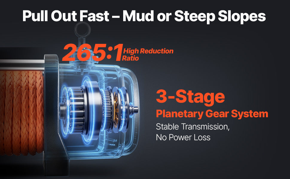 Power that Gets You Out of Any Jam: Our truck winch is driven by a 12V DC/6.6HP copper motor, delivering consistent power when you need it most. Featuring an advanced 3-stage planetary gear system and a 195.8:1 gear ratio, this winch ensures powerful pulling capacity, even in harsh weather and the deep mud. Get ready to tackle any challenge with confidence!