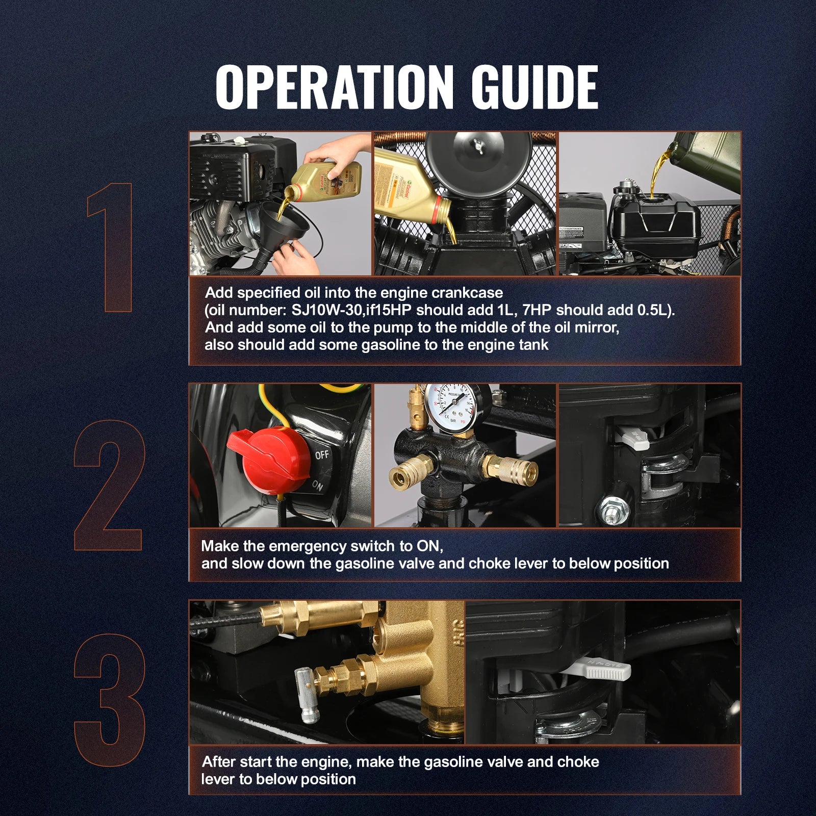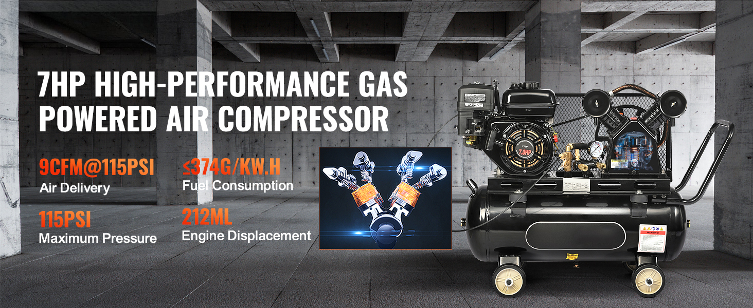 Powerful Performance: SucceBuy 7HP/15HP gas powered air compressor boasts powerful piston pump and 33CFM@115PSI impressive air delivery, allowing for fast inflation just within 2 minutes. High horsepower enables rapid air compression, less fuel-use and lower emission. (Maximum Pressure: 115PSI)