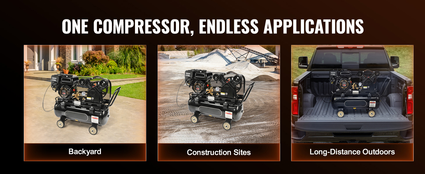 Versatile & Ready for Your Tasks: Ready to take on a wide range of tasks, our gas powered air compressor is compatible with various pneumatic and air tools— from nail guns, air sander, impact wrench to spray guns— greatly suited for chemical, light industry, food processing, construction and more.