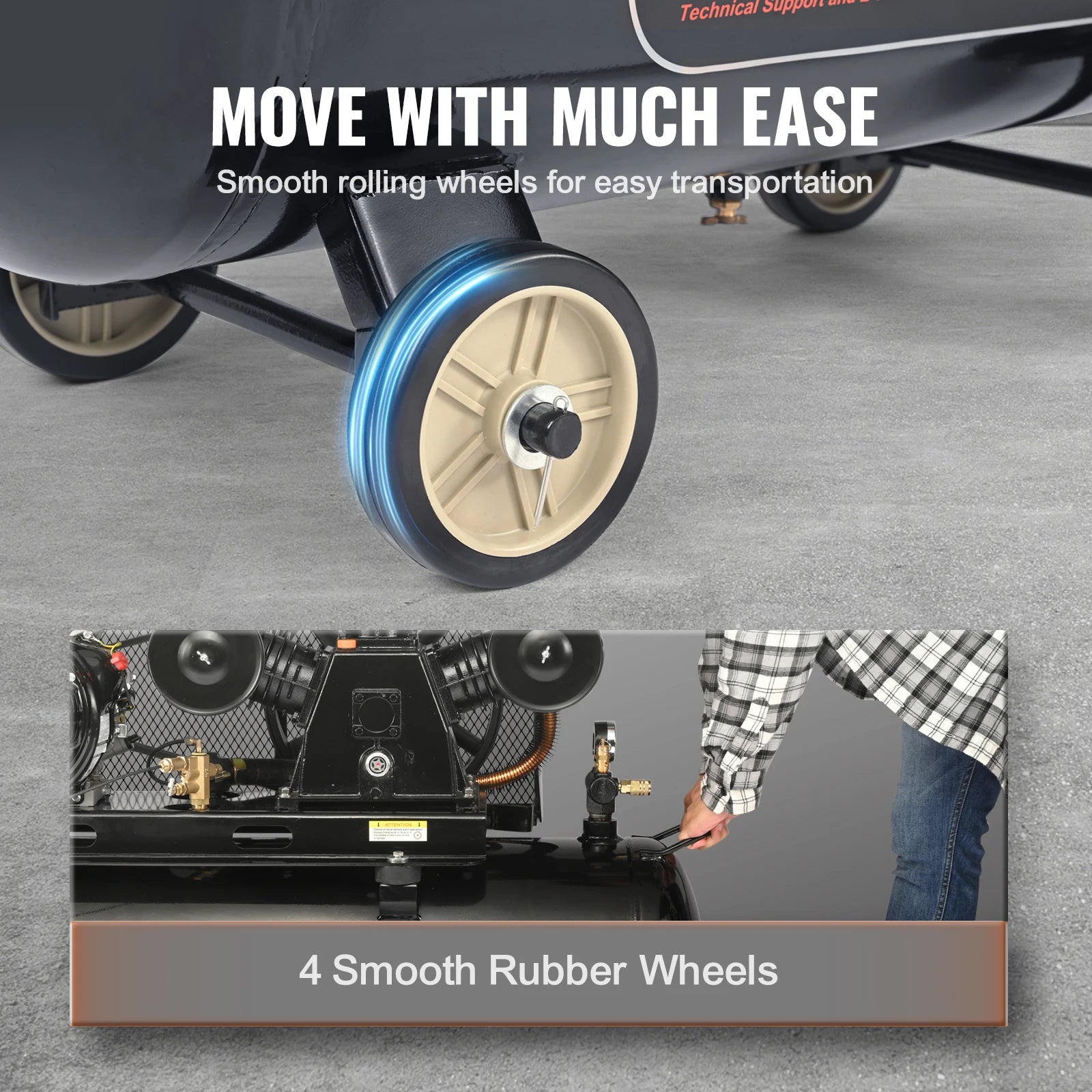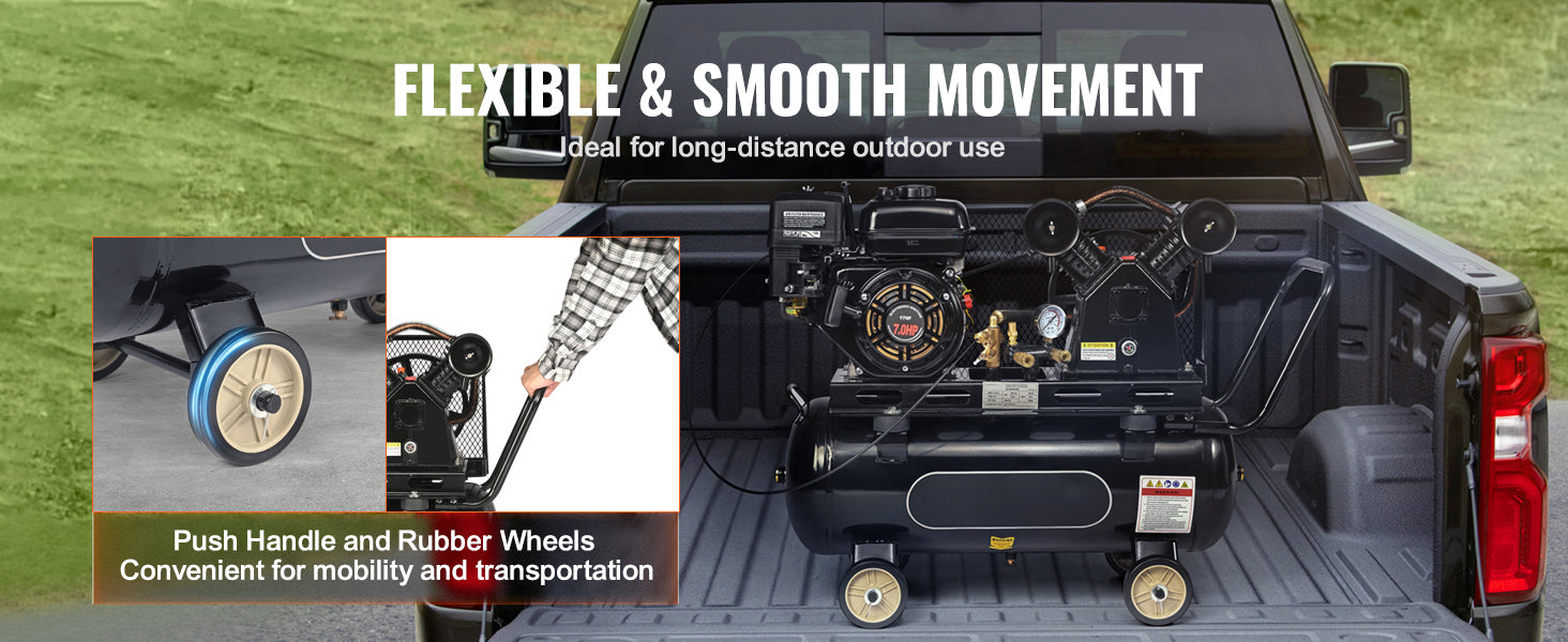 Move with Ease: 4 smooth rolling wheels offer great mobility, allowing you to move the piston pump air compressor to the desired location. Ready to hit the road, this air compressor tank is ideal for outdoor long-distance projects, easily transported for on-the-go tasks.
